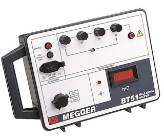 Megger BT51数字微欧表可用于测试大型金属架构的电阻、接地连接电阻、电缆连接电阻、避雷针电阻等,以及检查母线的连续性。也可以用于测试飞机的金属架构电阻。仪器的分辨率为0.01m Ω,能够检查飞机金属点之间的电阻