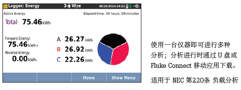 当设备的某部分运行时,它会立即消耗一定的电量(以瓦 (W) 或千瓦 (kW) 为单位)。运行期间,消耗的电量会累积,被称为消耗的电能(以千瓦时 (kWh) 为单位)。电能是电力公有偿提供的商品;电力公司会提供每千瓦时收费的标准。电力公司可能还要收取其他费用(例如峰值需求费),峰值需求是特定时间段(通常为 15 或30 分钟)的最大电力需求。此外,还有功率因数收费,这取决于设施中的容性负载或感性负载的效果。通常情况下,对峰值需求和功率因数进行优化会降低每月的电费。Fluke 1732和 1734 三相能耗功率计可以测量和区分这些影响,从而方便您分析结果并节约成本。简化的负载研究:如果进行电压连接很困难或不现实,那么简单的负载研究功能可让用户执行简化的负载研究(仅测量电流)。用户可以输入预期的额定电压,以创建模拟的功率研究。为了精确地研究功率和能源,用户需要同时监测电压和电流,但是这一简单的方法在某些情况下很实用。