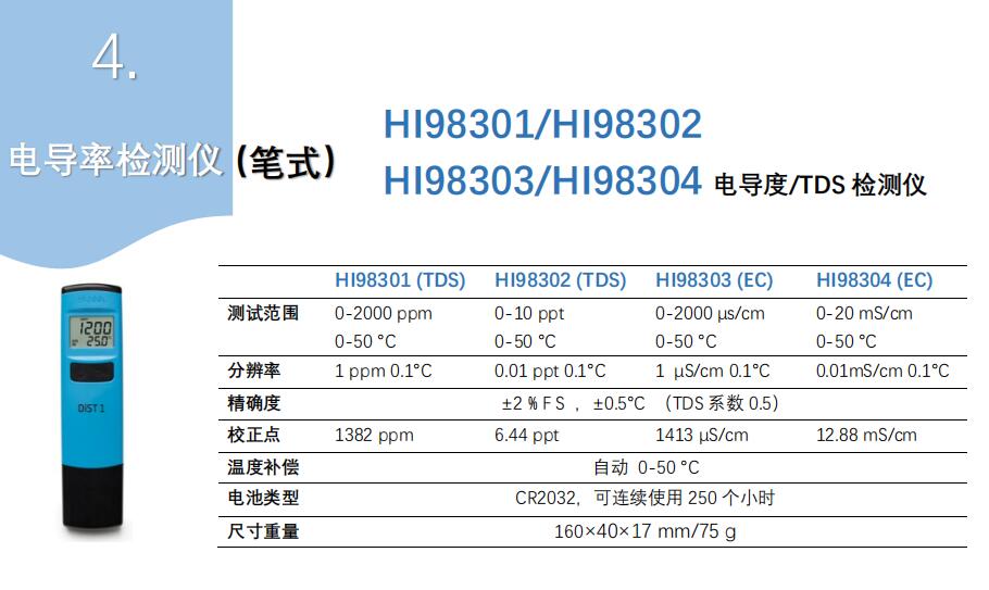新款外观设计,超大双行屏幕显示,操作便捷,自动识别单点【标准点@25°C:1382 ppm(mg/L)【推荐 HI7032】识别校准,自动温度补偿,确保测量数据和测量数据可靠性;
