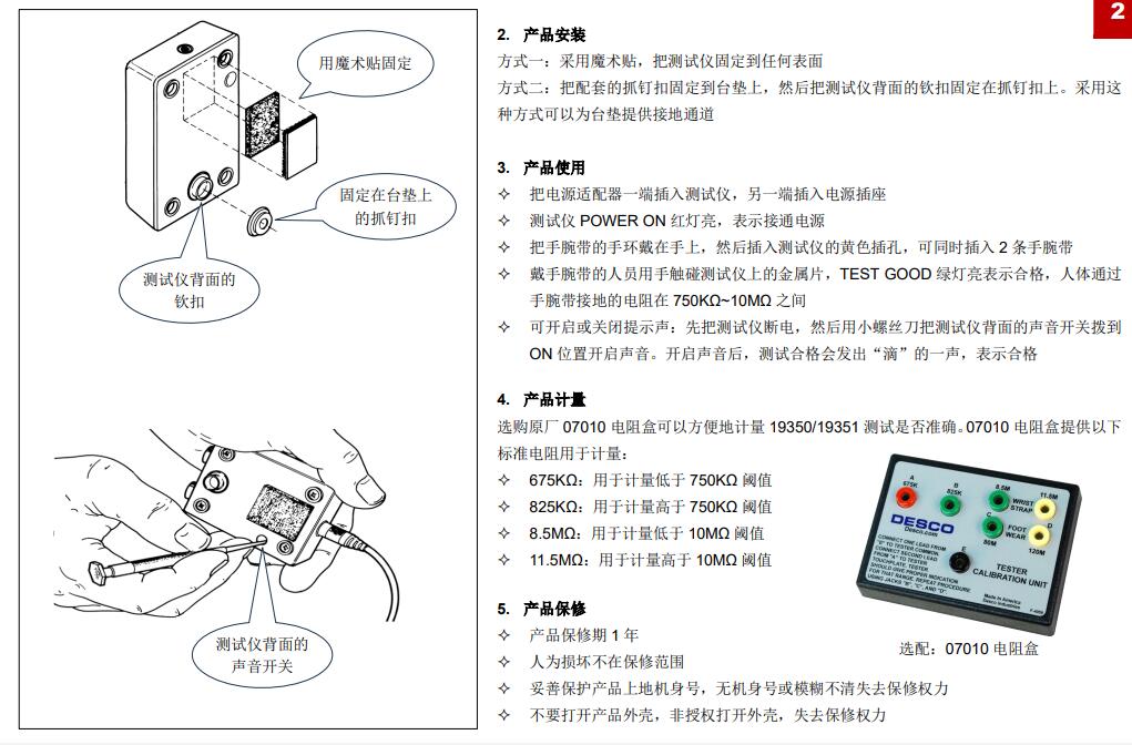 DESCO19350手腕带接地测试仪DESCO19351 Common Ground Wrist Strap Tester 产品描述:提供手腕带和台面接地,同时测试手腕带接地是否合格,订购货号:19350(配美规插头电源),19351(配IEC插孔电源)